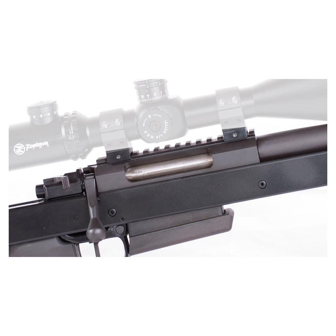Le boîtier polygonal intègre directement un rail Picatinny, permettant le montage d’une lunette ou d’autres dispositifs optiques. La détente directe réglable permet d’adapter le départ du coup selon les préférences du tireur, tandis que la sécurité mécanique à trois positions assure une manipulation sûre et intuitive : sécurité totale, position de tir et position intermédiaire permettant de manipuler la culasse sans pouvoir tirer.