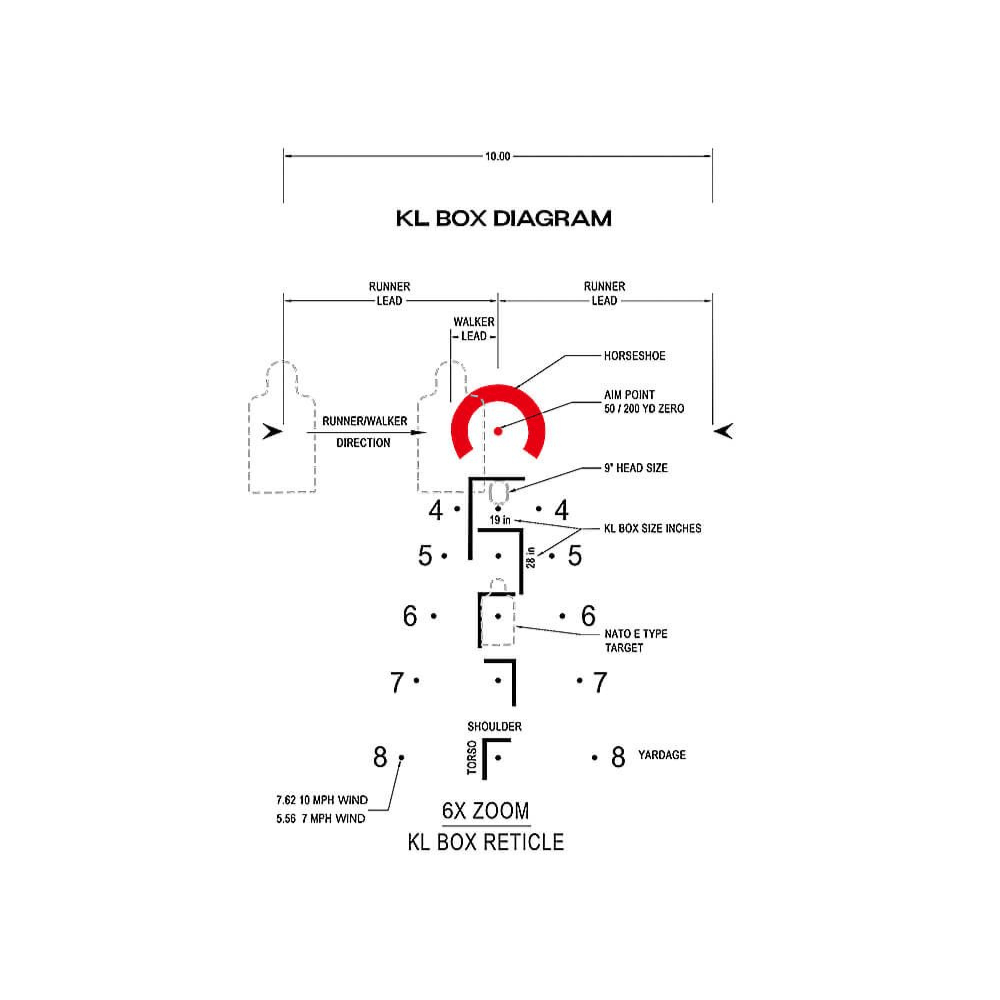 La lunette est équipée d’un réticule KLBOX BDC en second plan focal (SFP). Ce réticule intègre des repères balistiques permettant d’effectuer rapidement des corrections de tir. Le système KLBOX (Known Length Box) permet également d’estimer les distances en se basant sur des dimensions connues de cible.