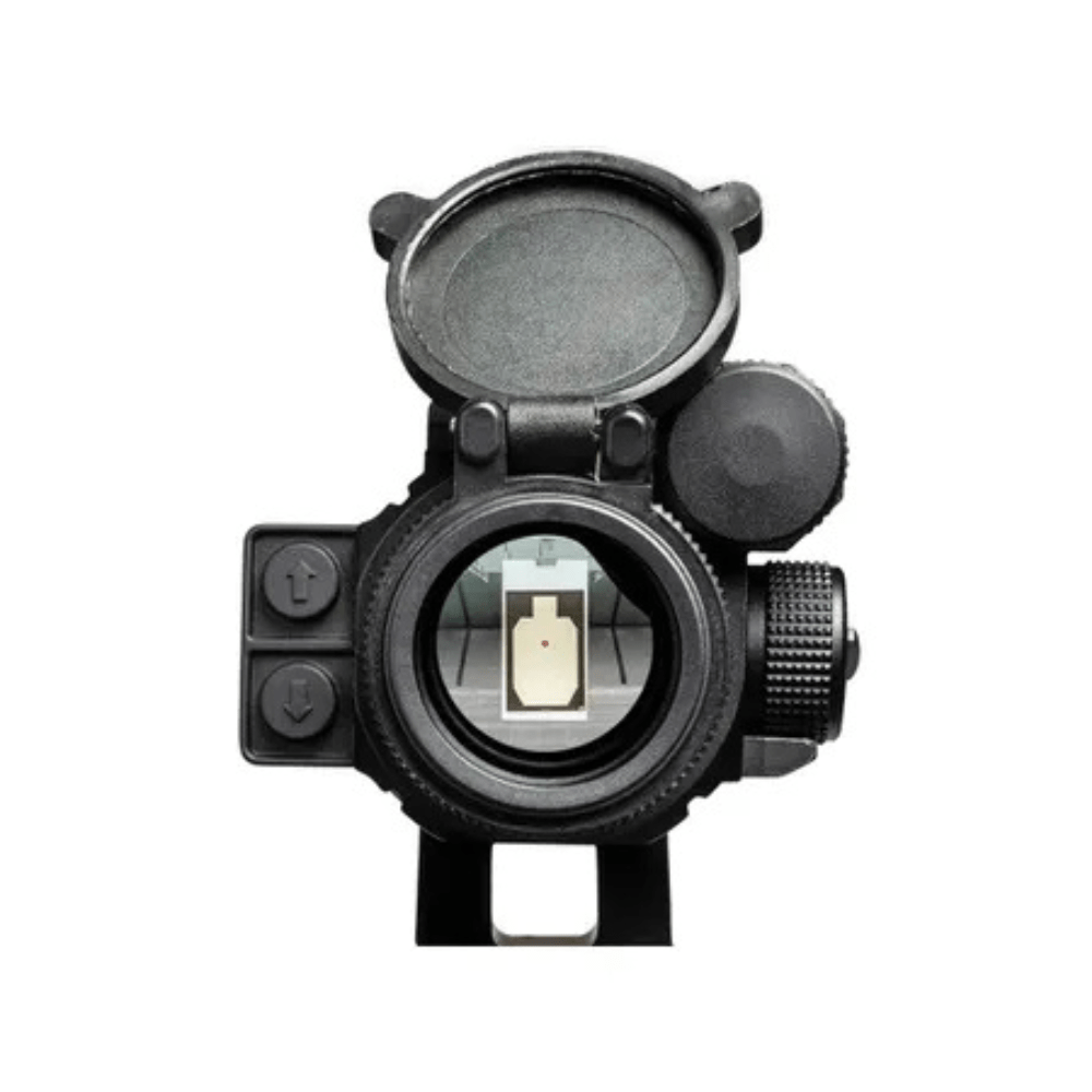 Doté d’un objectif large de 30 mm et d’un tube de 30 mm, il procure un champ de vision étendu, facilitant le tir dynamique les deux yeux ouverts. Son réticule point de 4 MOA, sélectionnable en rouge ou vert, garantit une excellente lisibilité quelles que soient les conditions lumineuses.